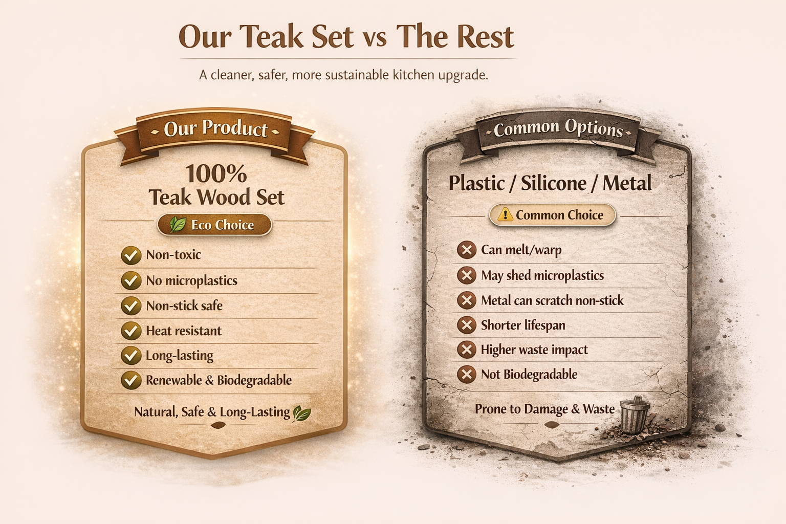 Unlike plastic utensils that shed microplastics and end up in landfill, teak wood is renewable and biodegradable. It’s a safer, more sustainable choice for your kitchen and the environment.